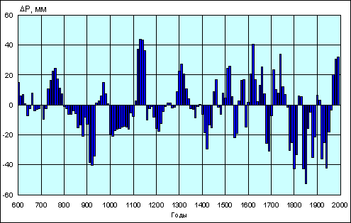 Отклонения среднего годового количества осадков (осреднение по 10-летиям) от современных значений для территории Русской равнины (обобщённые данные)