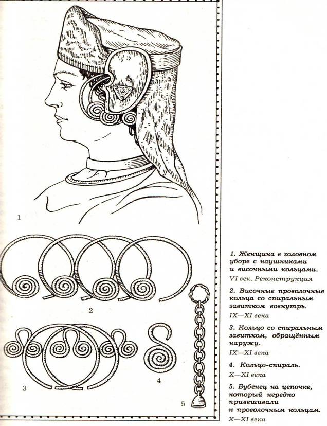 Особенно популярны среди украшений были шейные гривны – металлические обручи, которые надевали на шею. Древнему человеку такой обруч казался надёжной преградой, способной помешать душе покинуть тело. Также распространены были височные кольца. Славянские женщины подвешивали височные кольца к головному убору на лентах или ремешках, красиво обрамлявших лицо. Височные кольца были разнообразны: с гладкими металлическими бусинами, бусинами, украшенными зернью, и из ажурной тонкой филиграни. Распространены были браслеты, перстни, обереги, бусы, пояса.