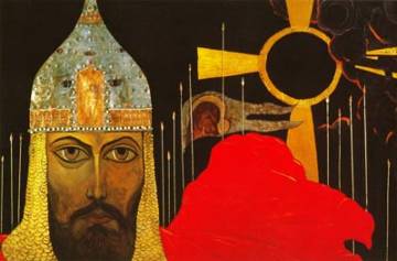 «Поход князя Игоря» скорее похожа на сказку, хотя и написана на историческую тему — сражение русского князя с половцами. Выразительны силуэты воинов, неудержимо движущихся вперед, их красные, червленые« щиты (по ним в Х11 веке узнавали русичей) озарены солнечным сиянием. Тревожная тень, падающая на войско с другой стороны, напоминает нам о солнечном затмении, предвещавшем войску неудачу…