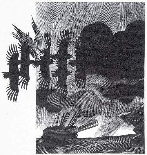 Художник размещает гравюры то у колонок текста, в виде полуполос, то на развороте листов. В случае разворотной иллюстрации ее композиция объединяет две развернутые страницы книги. На первом развороте в правой его половине возникает могучий образ князя Игоря - воплощение мужественности, героичности и силы. Левой половине разворота отводится роль своеобразного "зачина". У его левого края помещены летящие птицы с распластанными крыльями и кинжалоподобными перьями.