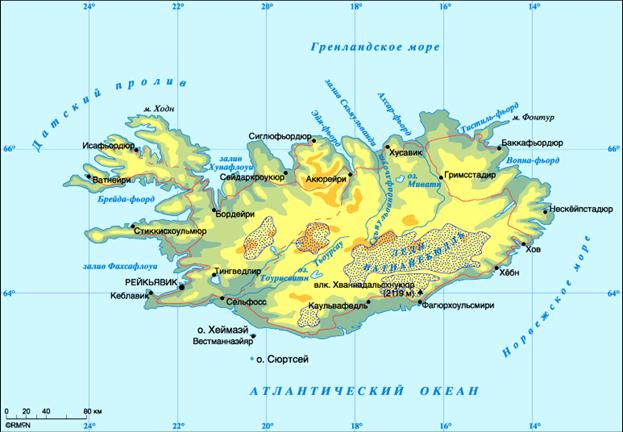 Вопреки своему названию и наличию ледников, Исландия — отнюдь не арктическая страна. Смягчающее влияние на ее климат оказывают теплые воды Северо-Атлантического течения (продолжения Гольфстрима), ветвь которого проходит вдоль южного и западного берегов острова. Средняя годовая температура на юго-западном побережье в Рейкьявике 4°С, средняя температура января – 1°С, июля — 11°С. Соответствующие показатели на северном побережье в Акюрейри: 3°С, – 2°С и 11°С. Прибрежные воды свободны ото льда в течение всего года. Исключение составляют ситуации, связанные с выносом полярных льдов на севере и востоке. В связи со значительным улучшением климата с начала 1920-х годов вынос полярных льдов к берегам Исландии произошел только однажды, в 1965 г. Погода в этой стране резко меняется, иногда в течение суток, что зависит от прохождения циклонов в восточном направлении через Атлантический океан. Среднее годовое количество осадков составляет 1300 – 2000 мм на южном побережье, 500 – 750 мм — на северном, и свыше 3800 мм на открытых к югу склонах Ватнайёкюдля и Мирдальсйёкюдля.