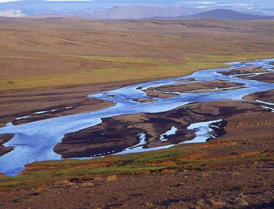 Благодаря обилию осадков в Исландии много довольно крупных рек, но они несудоходны. К югу от Ватнайёкюдля реки разветвляются на рукава, часто меняющие свое положение. Это серьезное препятствие для транспорта. Во время подледниковых вулканических извержений и при прорыве ледяных плотин на приледниковых озерах огромные массы талых вод вызывают бурные паводки на реках. Самые крупные озера Исландии — Тингвадлаватн и Тоурисватн.