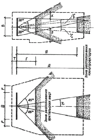 Параметры зрительного зала при установке кинопроекционного оборудования показаны на чертеже, где: