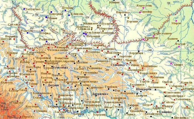 Булгарская топонимика (обозначена красным цветом) и курдская топонимика (обозначена черным цветом) на Правобережной Украине.