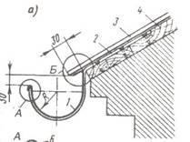 Карнизный свес начинают устраивать с установки штырей со скобами (для водоприемной воронки) и Т-образного костыля. Поперечные планки костылей размещают на расстоянии 120 мм от свеса дощатого настила. Штыри, как и костыли, врезают заподлицо в настил и крепят гвоздями или шурупами. Картины поочередно укладывают на костыли таким образом, чтобы их поперечные планки вошли в отгибы капельников.