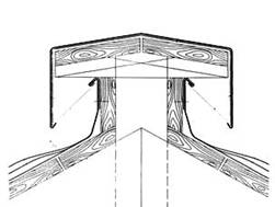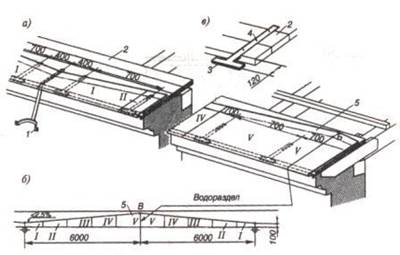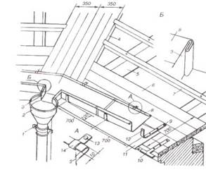 Для устройства карнизного свеса и настенных желобов укладывают сплошной дощатый настил шириной в 3..4 доски (700 мм). Вдоль конька кровли укладывают две сходящиеся кромками доски, которые служат для поддержания конькового стыка. Сплошной настил из досок устраивают также под разжелобками (на ширину до 500 мм в каждую сторону).