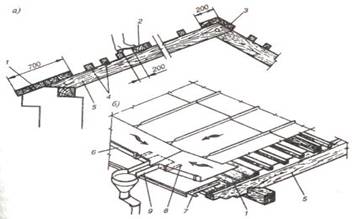 Все элементы металлической кровли – свесы, желоба, разжелобки, фартуки – устраивают по деревянной обрешетке. При расстоянии между стропилами 1,2….2м обрешетку устраивают из досок сечением 50х200мм и брусков сечением 50х50 мм. Бруски и доски располагают на расстоянии 200 мм друг от друга. При таком расположении деревянных элементов обрешетки ступня человека, идущего по скату крыши, будет всегда опираться хотя бы на один брусок, что предотвратит прогиб кровельного покрытия.