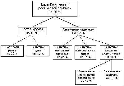 Как совместить целевые установки собственников и цели структурных подразделений предприятия, и какими критериями можно измерять степень достижения установленных целей?Совмещение целей производится путем последовательной декомпозиции цели верхнего уровня и построения «дерева целей». По каждой цели выбирается показатель, которым будет определяться достижение цели. По каждому показателю устанавливается его критериальное значение, которое будет определять успешность достижения цели.