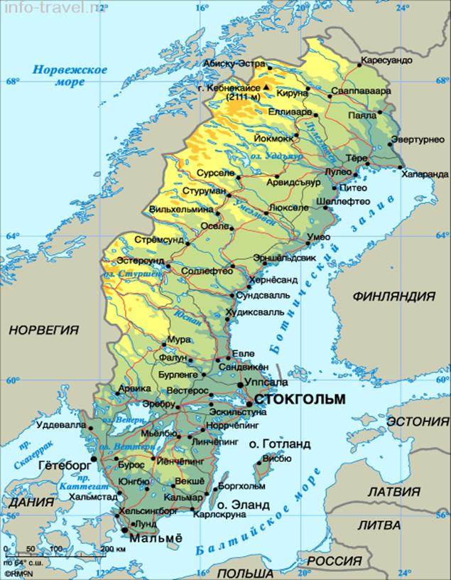 Швеция – крупнейшая страна Северной Европы. Она расположена на востоке и юге Скандинавского полуострова и занимает примерно 3/5 его территории. Сухопутными соседями страны являются Финляндия и Норвегия. В Балтийском море Швеции принадлежат два крупных острова – Готланд и Эланд. На юге и востоке территорию Швеции омывают воды Балтийского моря и Ботнического залива, на юго-западе — проливы Эресунн, Каттегат и Скагеррак.