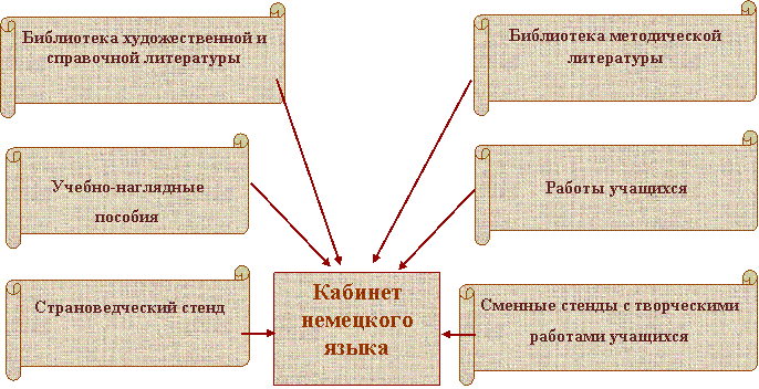 Необходимо иметь в классе современные ТСО и учебно-наглядные пособия (грамматические таблицы, аудиокассеты, видеоматериалы). Для работы на уроке используются аудиомагнитофон, видеомагнитофон с телевизором. Конечно, при наличии соответствующих возможностей, очень удобно, если кабинет иностранного языка будет оснащён компьютерами, что также будет способствовать росту интереса учащихся к работе на уроках немецкого языка. В кабинете иностранного языка организуется небольшая библиотека методической, художественной и справочной литературы для помощи организации самостоятельной работы учащихся и учителя. Рядом с небольшой библиотекой могут быть полки с яркими наглядными пособиями к урокам иностранного языка (игрушки, картинки и т. д.), а также поделки учащихся, которые могут быть изготовлены на уроках иностранного языка.