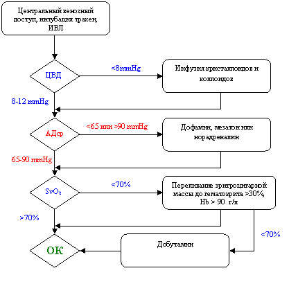 Начало вазопрессорной терапии возможно только при отсутствии эффекта от объемной нагрузки (ЦВД 8-12 mmHg). Препараты выбора – дофамин и(или) норадреналин (мезатон). Подбор доз осуществляется до восстановления адекватной органной перфузии (АДср > 65 mmHg, диурез > 0.5 мл/кг/ч). Нецелесообразно назначение дофамина в «ренальной» дозе. В случае неадекватного сердечного индекса (SvO2 < 70%, гиперлактатемия) необходимо добавление к терапии добутамина. В случае рефрактерного септического шока при адекватной объемной нагрузке и высоких дозах вазопрессоров возможно подключение вазопрессина в дозе 0.01-0.04 МЕ/мин.