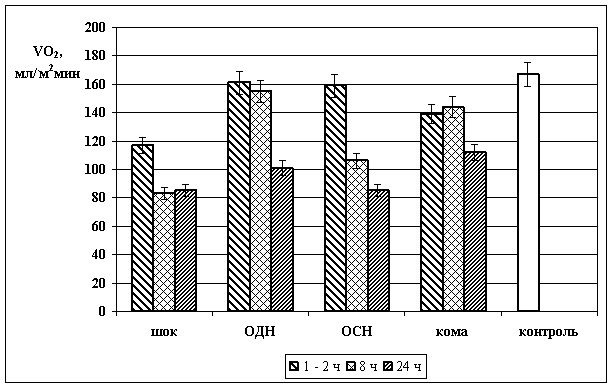 Рисунок 2. Потребление кислорода тканями (VO2) при различных клинических формах острого периода травматической болезни.