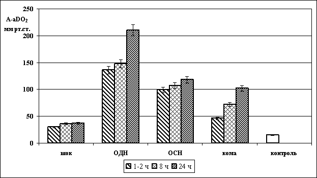 Рисунок 3. Динамика альвеолярно-артериального градиента кислорода (A-aDO2, мм РТ. ст.) при различных клинических формах острого периода травматической болезни.