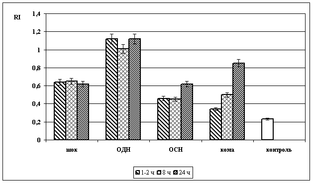 Рисунок 4. Динамика респираторного индекса (RI) при различных клинических формах острого периода травматической болезни.