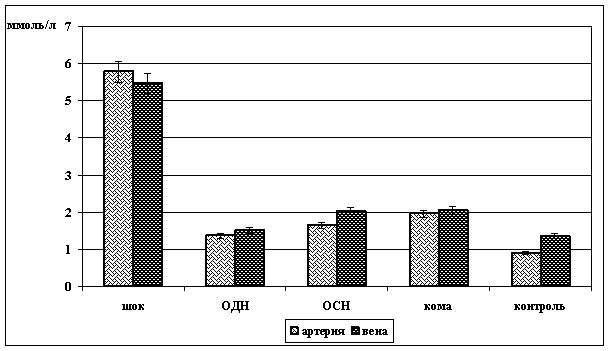У пострадавших с «ОСН» в течение 1-2 ч после травмы уровень лактата также превышал нормальные значения (в 1,5 - 1,8 раза), без выраженного артерио-венозного различия. Далее содержание лактата снижалось, хотя и недостоверно. ЛКИ в этой группе пострадавших при поступлении превышал норму в 2,6 раза и продолжал расти, свидетельствуя о неадекватной доставке кислорода тканям.