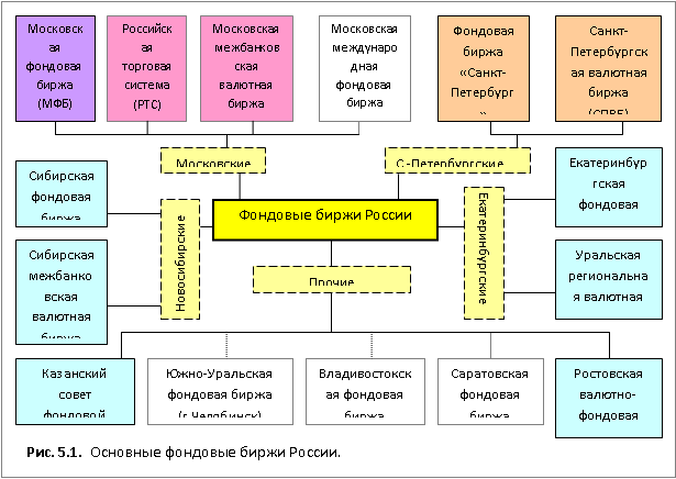 К началу первого десятилетия XXI века лишь 15 бирж имели лицензию на осуществление фондовой деятельности (см.: рис. 5.1). Из них 4 биржи были зарегистрированы в Москве; по 2 – в Санкт-Петербурге, Новосибирске и Екатеринбурге; по 1 – в Казани, Челябинске, Саратове и Владивостоке. Однако с марта 2001 г. прекратили свою деятельность ММФБ, Саратовская фондовая биржа, Владивостокская фондовая биржа. С декабря 2001 г. – Южно-Уральская фондовая биржа.