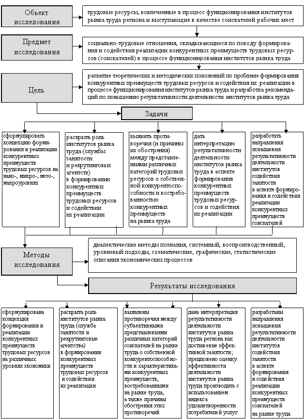 Цель диссертационного исследования. Цель данной работы заключается в развитии теоретических и методических положений по проблеме формирования конкурентных преимуществ трудовых ресурсов и содействия их реализации в процессе функционирования институтов рынка труда, в частности институтов содействия занятости, и разработке рекомендаций по повышению результативности деятельности институтов содействия занятости в данном аспекте.