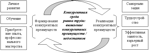 Формирование и реализация конкурентных преимуществ на микроуровне предполагает развитие работника в профессиональном и личностном плане под воздействием организационной среды, конкуренции на внутреннем рынке труда организации. В рамках организационной среды на основе имеющегося трудового потенциала работника (психофизиологические и личностные качества, образовательный потенциал и пр.) происходит формирование, совершенствование и реализация важнейших составляющих конкурентных преимуществ работника – профессиональных качеств, умений, навыков, компетенций.