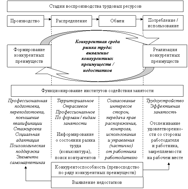 Конкурентоспособность (превосходство по ряду конкурентных преимуществ) соискателей проявляется непосредственно на рынке труда, на стадиях распределения и обмена. На стадии распределения важны интегрирующая и информационно-распределительная функции институтов содействия занятости, сводящиеся к уменьшению неопределенности субъектов посредством аккумуляции и снабжения информацией о состоянии рынка труда, возможных действиях других индивидов, облегчению установления связей между субъектами рынка труда со стороны спроса и предложения, экономии на трансакционных издержках. На стадии обмена преобладает регулирующая функция, способствующая согласованию интересов сторон при передаче прав распоряжения, контроля, использования рабочей силы от работника работодателю.
