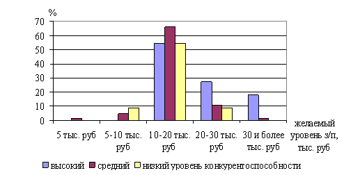 В свою очередь, высокая оценка конкурентоспособности (10%) присуща для соискателей с высшим (20%) и средним специальным образованием (7%), занимающихся поиском работы менее месяца (25%), ориентированных на высокий уровень оплаты труда (рис. 5). По мнению респондентов, конкурентоспособность на рынке труда определяют следующие факторы: опыт, приобретенный в процессе трудовой деятельности (74%), соответствующий уровень образования (37%), коммуникабельность (37%), профессиональное мастерство (36%). Менее значимые факторы – самообразование, работа над собой (22%), организаторские способности (20%), своевременное повышение квалификации (18%), состояние здоровья (18%). Заметим, что респонденты не уделяют достаточного внимания таким важным факторам как самообразование и повышение квалификации, которые необходимы для поддержания актуальности имеющихся профессиональных знаний в быстро меняющихся экономических, технологических, информационных условиях.