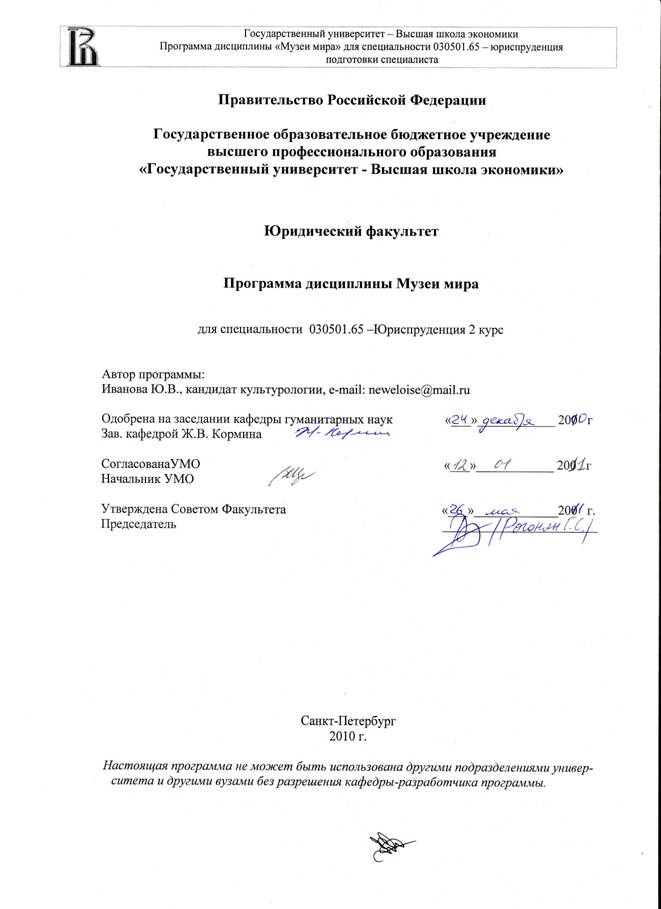 Для специальности 030501.65 «Юриспруденция» подготовки специалиста дисциплина «Музеи мира» является факультативом.