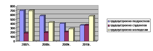 Вопросами трудоустройства подростков и молодежи по отрасли «Молодежная политика» занимается МУ «Молодежная биржа труда». В данном направлении основной упор делался на привлечение работодателей. В 2010г. заключено 99 договоров на трудоустройство подростков, трудоустроено – 1035 человек, из них 366 несовершеннолетних, в основном это дети и подростки из малообеспеченных и многодетных семей, состоящие на учете в комиссии по делам несовершеннолетних.