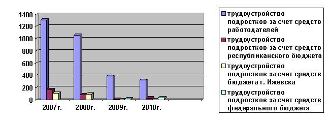 Следует отметить, что наблюдается тенденция к сокращению количества трудоустроенных подростков через МУ «Молодежная биржа труда». Данное снижение связано с изменениями на рынке труда и отсутствием финансирования из бюджета г. Ижевска: в 2007г. за счет средств городского бюджета трудоустроено 104 подростка, в 2008г. – 92 подростка, в 2009 и 2010гг. – 0 человек. За счет средств республиканского бюджета в 2007г. трудоустроено 168 подростков, в 2008г. – 78, в 2009г. – 5, в 2010г. – 27. За счет средств федерального бюджета в 2009г. трудоустроено 11 подростков, в 2010г. – 35 подростков (Схема № 2).