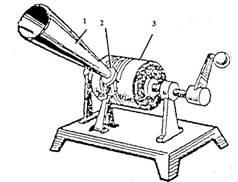 1 - рупор; 2 - мембрана с иглой; 3 - восковой валик.