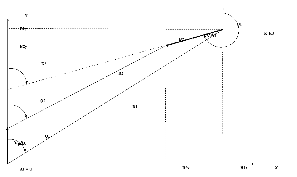 Везде, где на рис. 4 показаны векторы скоростей цели V, собственного судна Vм и относительной скорости их перемещения Vr, можно оперировать соответствующими расстояниями, пройденными за некоторое время Dt: V*Dt, Vм*Dt, Vr*Dt.