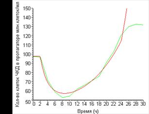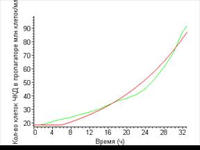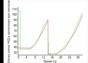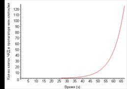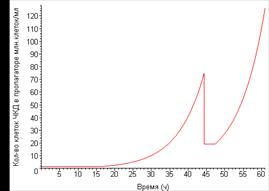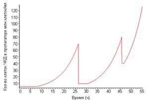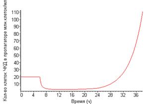 Составлены математические модели пропагации ЧКД в различных системах позволяющие получить графики роста содержания клеток в пропагаторе в зависимости от заданных начальных условий и применяемой системы пропагации (рис 4, 5, 6).