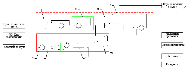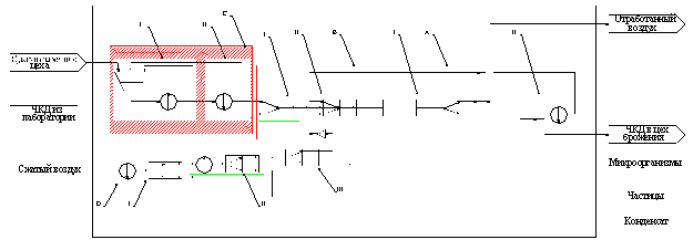 A – подсистема пропагации (I – оператор стерилизации сусла, II – оператор охлаждения сусла, III – оператор смешения и насыщения кислородом), B – подсистема подготовки технологического воздуха (I – оператор влагоотделения, II – оператор тонкой очистки, III – оператор бактериальной очистки)