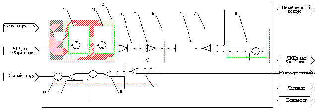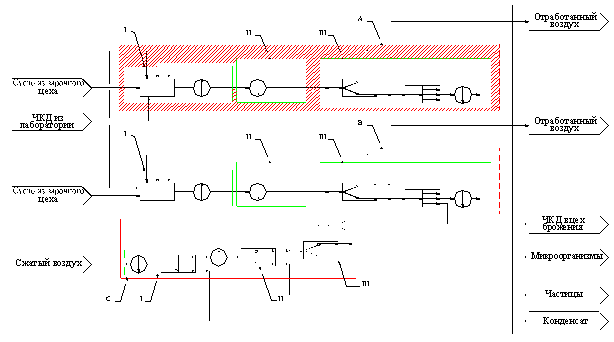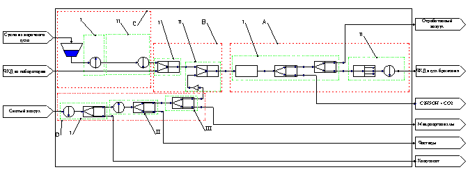 A – подсистема пропагации (I – оператор размножения клеток, II – оператор размельчения комков), B – подсистема смешения и насыщения воздухом (I – оператор смешения сусла и ЧКД из лаборатории, II – оператор аэрации сусла), С – подсистема подготовки сусла (I – оператор стерилизации сусла, II – оператор охлаждения сусла), D – подсистема подготовки технологического воздуха (I – оператор влагоотделения, II – оператор тонкой очистки, III – оператор бактериальной очистки)