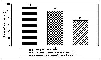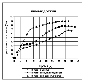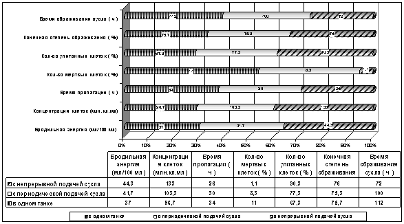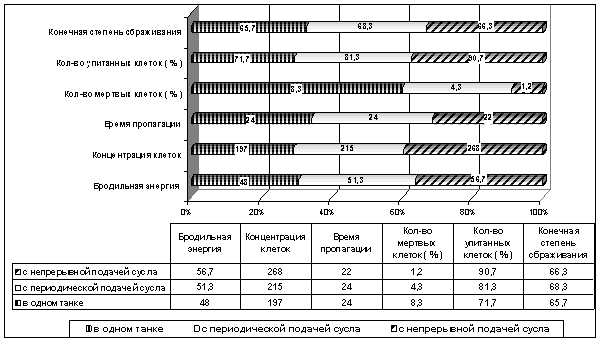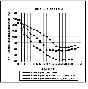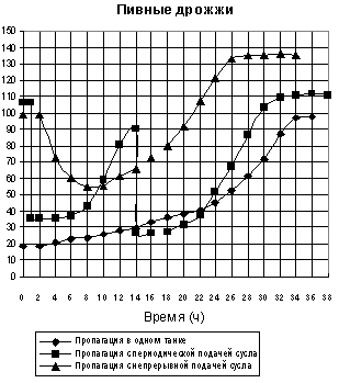 Как видно из табл.2 и 3 при пропагации с непрерывной подачей сусла в пропагатор наблюдается не только значительное увеличение количественных показателей – то есть достигнутого содержания клеток на 30%, но и сокращение срока пропагации на 10 ч.