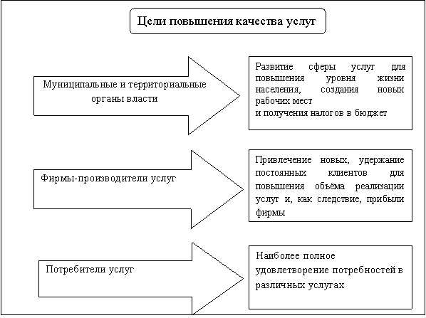 2. Определены цели повышения качества услуг (повышение уровня жизни населения, создание новых рабочих мест и увеличение суммы налогов, уплачиваемых в бюджет; привлечение новых, удержание постоянных клиентов для повышения объёма реализации услуг; наиболее полное удовлетворение потребностей в различных услугах), основанные на особенностях деятельности субъектов рынка (муниципальные и территориальные органы власти, фирмы-производители услуг, потребители услуг), что позволяет удовлетворить установленные и планируемые потребности.