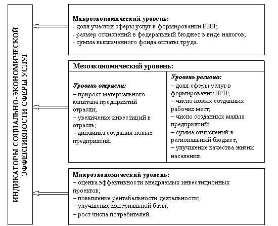 6. Социально-экономическая эффективность сферы услуг даёт представление об экономической эффективности инвестиционных вложений с учётом достигнутого социального эффекта. Индикаторы социально-экономической эффективности сферы услуг зависят от уровня экономики, на котором определяется социально экономическая эффективность.
