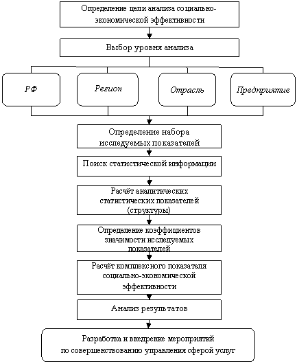 Представленное исследование социально-экономической эффективности сферы услуг может быть проведено согласно алгоритму анализа (Рис. 9).