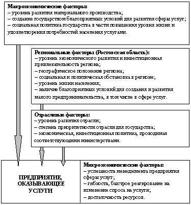 Для развития сферы услуг Ростовской области, на наш взгляд, необходим комплексный подход, учитывающий все факторы, влияющие на её функционирование. Такие факторы можно разделить на четыре группы в зависимости от уровня влияния (Рис. 10):