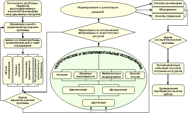Научная концепция. Разработка и научное обеспечение подходов, принципов и методов интенсификации и создания высокоэффективных технологий производства экструдированных продуктов функционального назначения с соответствующим аппаратурным оформлением на основе комплексного анализа основных закономерностей процесса совместно с физико-химическими и структурно-механическими характеристиками модельных объектов; разработка системы автоматизированного проектирования перспективного экструзионного оборудования нового поколения, обеспечивающего рациональное использование материальных и энергетических ресурсов.