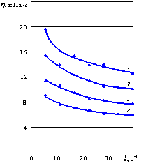 Реологические свойства смеси крошки из ЧДХ с добавкой СППП и гречихи с соей изучены с помощью капиллярного вискозиметра. Исследовали влияние температуры и влажности на вязкость пищевых смесей: температура была изучена в интервале от 408 до 453 К, влажность – от 12 до 20 %. Были получены кривые течения и зависимости вязкости от скорости сдвига (рис. 3), показывающие качественное поведение псевдопластических жидкостей.