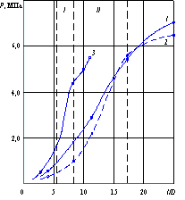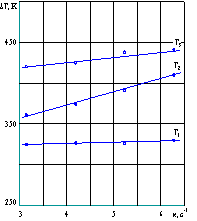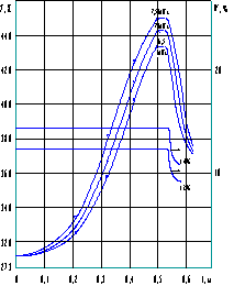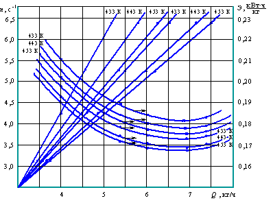 По виду графика (рис. 4) сделан вывод, что разогрев продукта в рабочей камере экструдера происходит гораздо быстрее с повышением угловой скорости вращения шнека. Последующее падение температуры обусловлено выходом экструдата из формующего канала матрицы. Увеличение начальной влажности смеси и ее температуры приводило к возрастанию скорости протекания процесса экструзии за счет снижения вязкости расплава в предматричной зоне. Распределение температуры продукта по длине экструдера (рис. 5) характеризуется ее резким возрастанием, начиная с зоны сжатия вплоть до предматричной области. В матрице она постоянна из-за небольшого отрезка времени нахождения в ней и при выходе продукта из формующего канала быстро понижается до 370…380 К за счет взрывного испарения воды и выделения значительного количества энергии. Причем с увеличением давления в предматричной зоне температура пищевой смеси несколько повышается. Начальная влажность пищевой среды по длине экструдера не изменяется (т. е. имеет постоянный вид за счет герметичности рабочей камеры экструдера и отсутствия зон дегазации) до попадания экструдата в зону атмосферного давления, где мгновенно испаряется примерно 10…20 % воды. Проанализированный характер изменения температуры и давления по времени и длине рабочей зоны позволил оценить влияние этих параметров на ход процесса экструзии, обосновать его рациональные режимы и получить рабочие характеристики одношнекового экструдера при оптимальных удельных расходах электроэнергии на производство палочек.