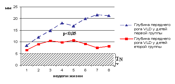 В катамнезе на протяжении первого года жизни ежемесячно было обследовано 52 ребенка, в том числе 26 выживших детей первой группы и все 26 детей второй группы. Обследование в катамнезе включало проведение неврологического осмотра с оценкой психоневрологического развития, нейросонографию с вентрикулометрией, допплерографическое исследование мозгового кровотока.