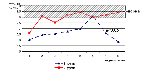 Как видно из таблицы 6, разница темпов развития у детей в 1 и 2 группах при оценке по шкале CAT/CLAMS становилась достоверной уже к 4 месяцам. Учитывая, что нормальный коэффициент развития составляет 75% и более, очевидно, что компенсации темпов психоневрологического развития дети второй группы достигали в среднем к возрасту 5-6 месяцев, тогда как у детей первой группы даже к возрасту 12 месяцев в большинстве случаев сохранялась грубая задержка психоневрологического развития.