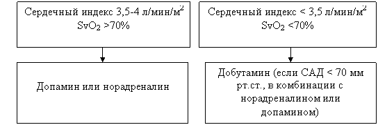 Низкое перфузионное давление требует немедленного включения препаратов повышающих сосудистый тонус и \или инотропную функцию сердца. Допамин и/или норадреналин являются препаратами первоочередного выбора коррекции гипотензии у больных с септическим шоком (категория доказательств С).
