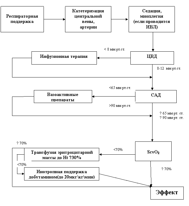1. Гемодинамическая поддержка: ЦВД 8-12 мм рт. ст., АДср более 65 мм рт. ст., диурез 0,5мл/кг/ч, гематокрит более 30%, сатурация смешанной венозной крови не менее 70%,