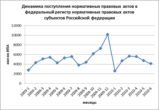 В настоящее время объем ежемесячных поступлений нормативных правовых актов в федеральный регистр нормативных правовых актов субъектов Российской Федерации составляет 4–8 тыс. актов. Такой объем поступлений наблюдается в 2009–2010 годах. На рис. 1 представлена динамика поступлений по месяцам с января 2009 по июнь 2010 года по дате принятия нормативного правового акта.