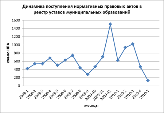В настоящее время объем ежемесячных поступлений нормативных правовых актов в федеральный регистр муниципальных нормативных правовых актов составляет около 1 тыс. актов. Такой объем поступлений наблюдается в 2009–2010 годах. На рис. 2 представлена динамика поступлений по месяцам с января 2009 по июнь 2010 года по дате принятия нормативного правового акта.