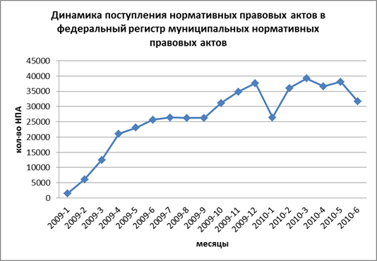 В настоящее время объем ежемесячных поступлений нормативных правовых актов в федеральный регистр муниципальных нормативных правовых актов составляет 30–40 тыс. актов. Такой объем поступлений сформировался со второй половины 2009 года. На рис. 3 представлена динамика поступлений по месяцам с января 2009 по июнь 2010 года (по июлю –актов, поступления не завершены).