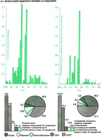 Максимум этих испытаний приходится на два периода: первый - на годы, когда взрывы проводили Великобритания, США и СССР, и второй, более значительный, - на годы, когда их проводили в основном Соединенные Штаты и Советский Союз. Во время первого периода большую часть испытаний провели США, во время второго-СССР (рис. 4.7).