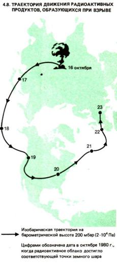 Часть радиоактивного материала выпадает неподалеку от места испытания, какая-то часть задерживается в тропосфере (самом нижнем слое атмосферы), подхватывается ветром и перемещается на большие расстояния, оставаясь примерно на одной и той же широте. Находясь в воздухе в среднем около месяца (рис. 4.8), радиоактивные вещества во время этих перемещений постепенно выпадают на землю. Однако большая часть радиоактивного материала выбрасывается в стратосферу (следующий слой атмосферы, лежащий на высоте 10-50 км), где он остается многие месяцы, медленно опускаясь и рассеиваясь по всей поверхности земного шара.