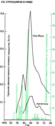 Содержание стронция-90 и цезия-137 в продуктах питания и суммарная годовая мощность ядерных взрывов в атмосфере. Обратите внимание на значительно более высокий уровень радиационного загрязнения в Северном полушарии (Нью-Йорк и Дания) по сравнению с Южным (Аргентина)